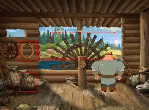 - Зайдите на мельницу, снимите хомут со стены и возьмите мешок муки