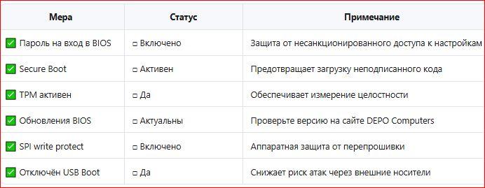 - Используйте инструменты типа CHIPSEC для проверки конфигурации безопасности BIOS