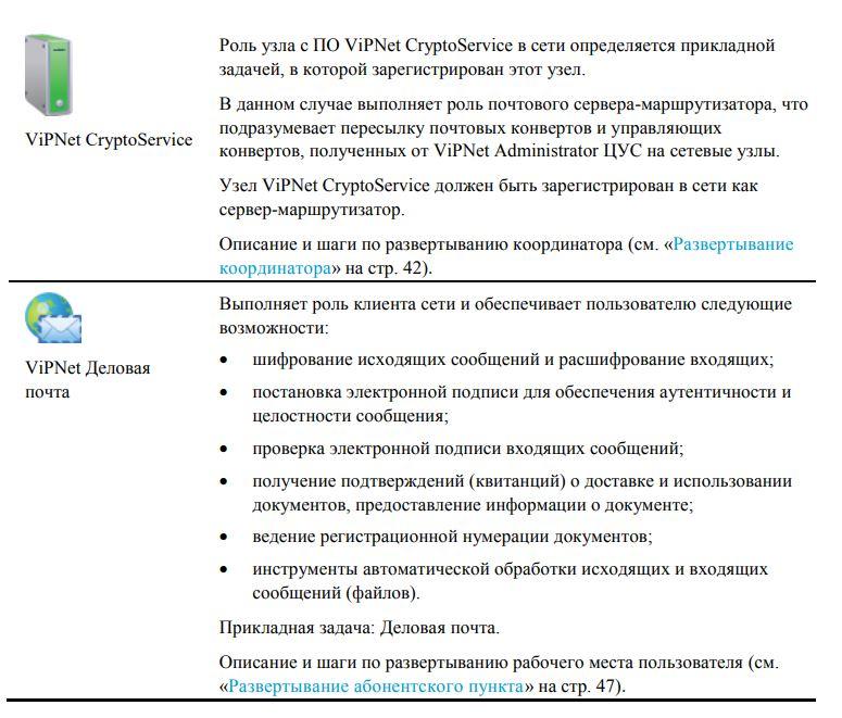 Помимо установки ПО каждый из узлов сети должен быть зарегистрирован в соответствующей прикладной задаче, которая определяет его роль в сети. Состав и количество прикладных задач, доступных в конкретной конфигурации сети ViPNet, определяется файлом лицензии. Назначение каждого из узлов сети ViPNet для организации электронного документооборота приводится в таблице ниже.