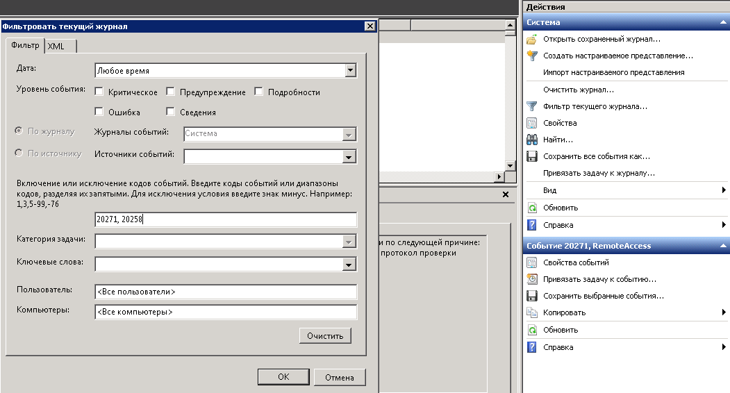 Смотрим логи в просмотре событий на данном сервере. Открываем оснастку и переходим в раздел Система. Ловить мы будем Код события 20271 и Код события 20258
